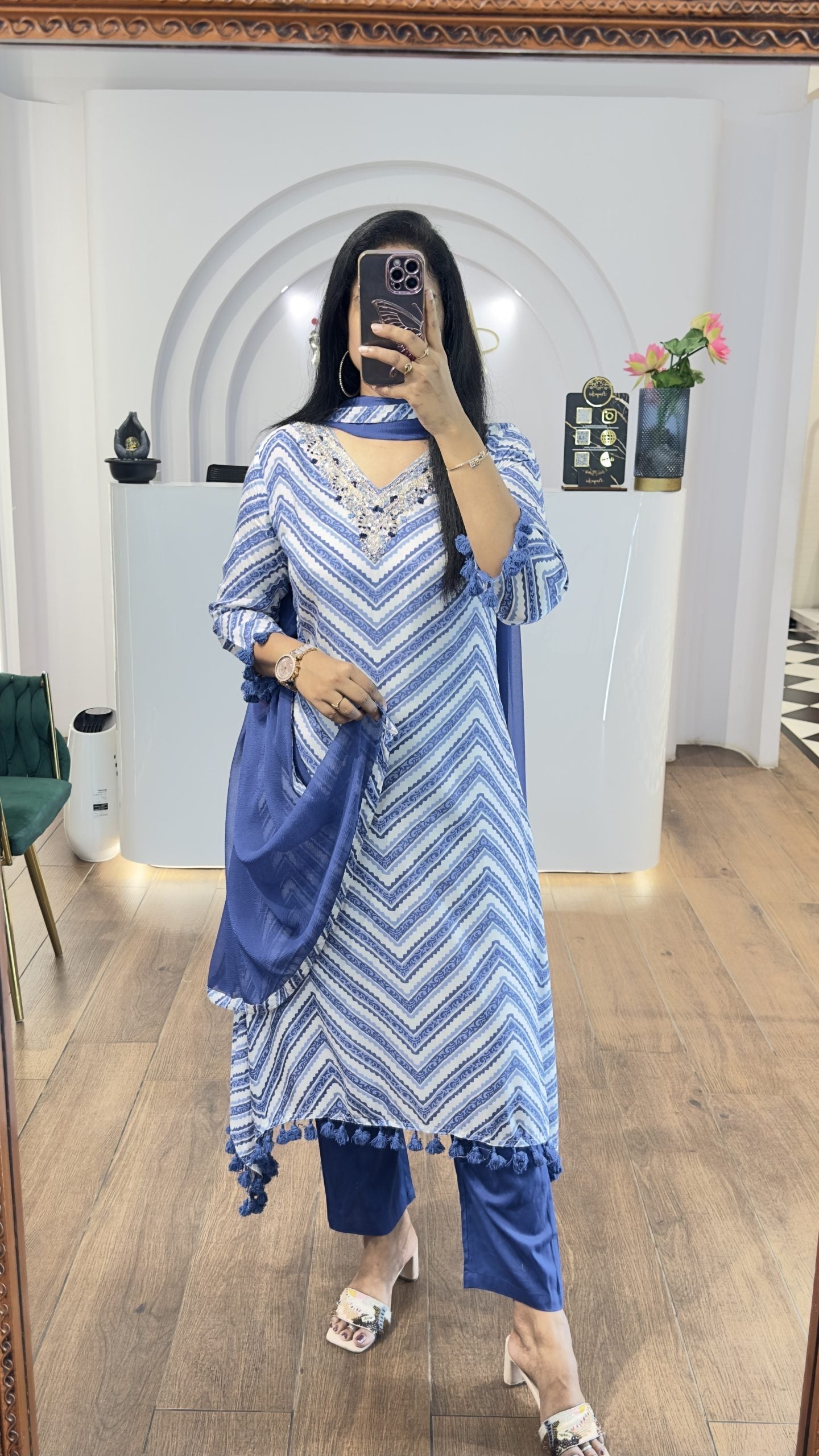 Blue Zig Zag Printed Handwork HighLow Kurti