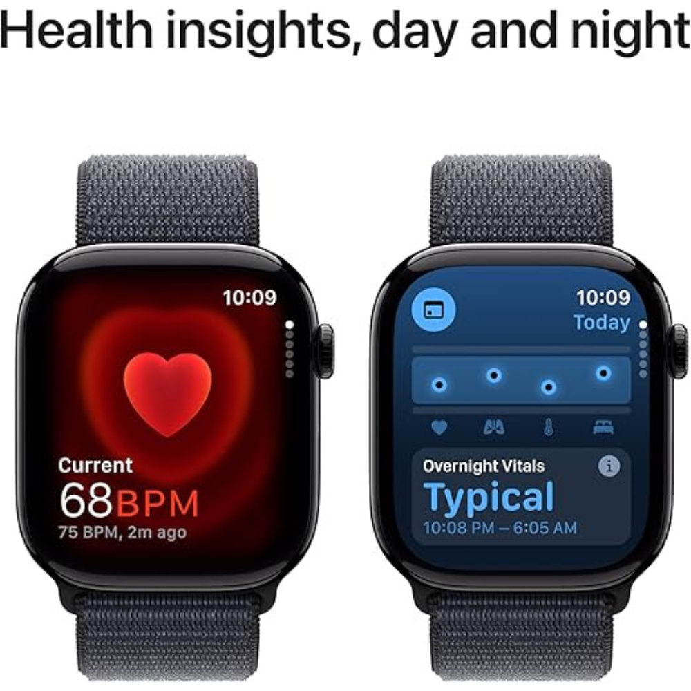 With the Watch Series 10, health is at your fingertips. Take an ECG anytime and receive notifications for high or low heart rates or irregular rhythms. The Vitals app tracks your overnight metrics like heart and respiratory rates, and even helps monitor sleep apnea. Additionally, it provides menstrual cycle tracking with ovulation estimates, giving you a complete picture of your well-being.